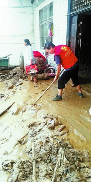 王長(zhǎng)鎖幫助受災(zāi)群眾清理院落淤泥