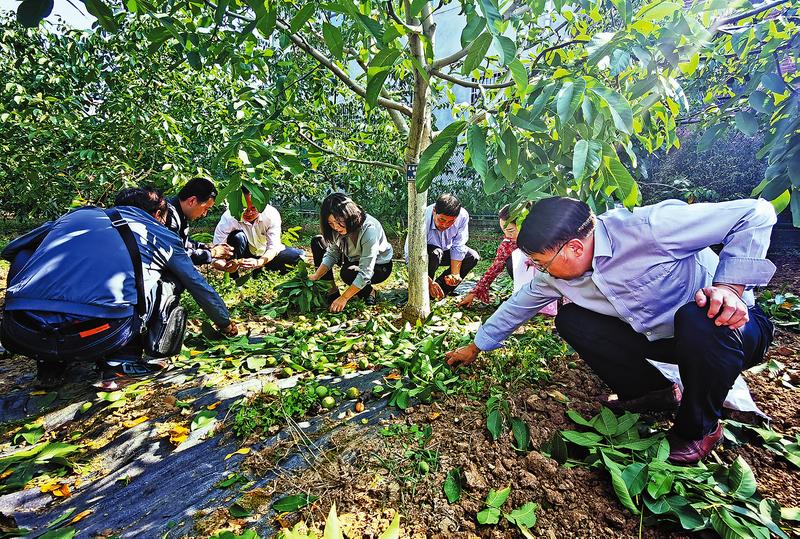 市、縣核桃研究所專家及技術(shù)人員對核桃生長、結(jié)果及產(chǎn)量進行現(xiàn)場測評。