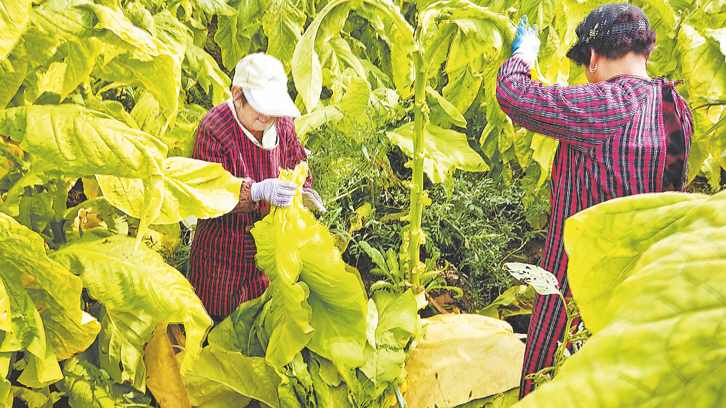 景村鎮(zhèn)八一村惠民烤煙種植合作社組織人員采摘煙葉(本報(bào)記者 楊 鑫 攝)