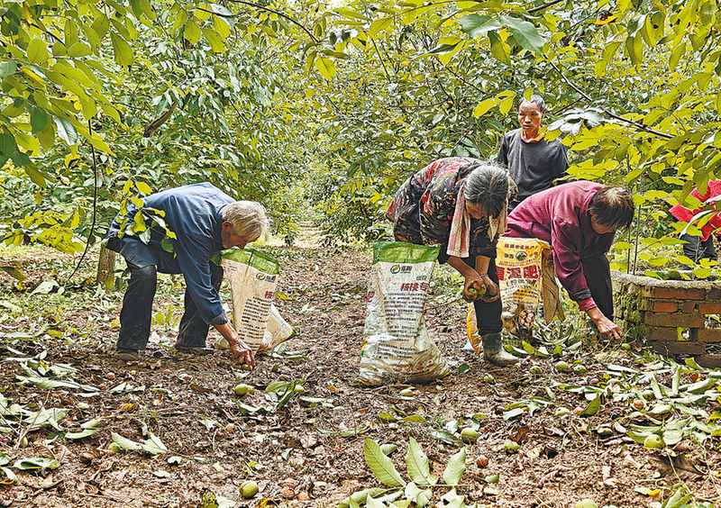 △剛剛從樹(shù)上打下來(lái)的鮮核桃,村民及時(shí)撿拾,收集后運(yùn)送至廠區(qū)。