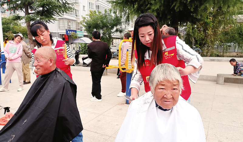 近日,志愿者在景村街社區(qū)廣場(chǎng)開(kāi)展孝德實(shí)踐活動(dòng),為轄區(qū)老人義務(wù)理發(fā)。