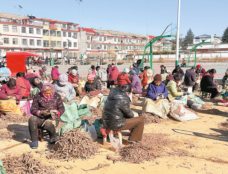 興龍嶺廣場(chǎng)上刮桔梗的繁忙景象,正是古城鎮(zhèn)延伸中藥材產(chǎn)業(yè)鏈、提升產(chǎn)業(yè)價(jià)值的生動(dòng)體現(xiàn)。近年來(lái),古城鎮(zhèn)立足桔梗、連翹、天麻等道地藥材的種植傳統(tǒng)與區(qū)位優(yōu)勢(shì),以特色產(chǎn)業(yè)振興為抓手,推動(dòng)中藥材產(chǎn)業(yè)穩(wěn)步發(fā)展。截至2025年年底,全鎮(zhèn)以丹參、連翹、桔梗等為主的中藥材種植面積已有1.6萬(wàn)畝,形成規(guī)?;⒍鄻踊男掳l(fā)展格局。