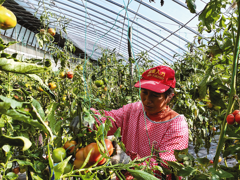 1月7日,在陶嶺社區(qū)溫室大棚內(nèi),工人在采摘成熟的西紅柿。