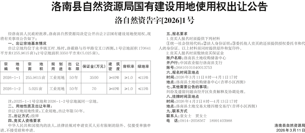 洛南縣自然資源局國(guó)有建設(shè)用地使用權(quán)出讓公告