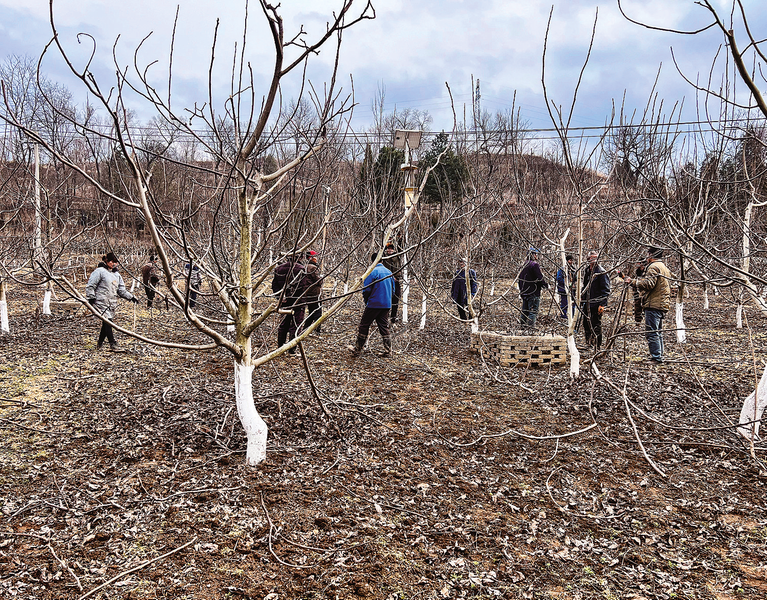 在景村鎮(zhèn)八一村紅仁核桃示范基地,務(wù)工群眾對(duì)核桃樹(shù)進(jìn)行剪枝管護(hù)。