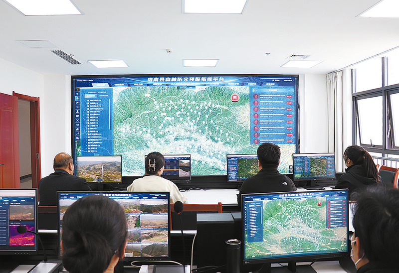 洛南縣森林防火預(yù)警指揮平臺(tái)指揮大廳內(nèi),工作人員實(shí)時(shí)關(guān)注全縣森林防火情況。
