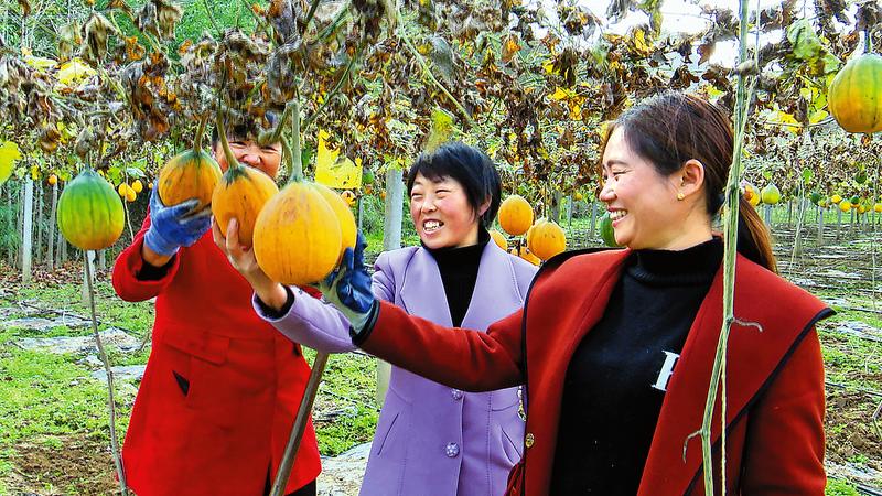 在趙川鎮(zhèn)店坊河村的千畝瓜蔞基地里,一排排架子上爬滿了藤蔓,大大小小、金黃色的瓜蔞掛滿枝頭,村民們滿懷喜悅地采摘瓜蔞,收獲一年的勞動成果。