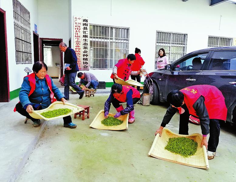“陳鳳梅2.8斤”“陳改蓮3.4斤”“陳金云2.9斤”……4月10日,商南縣城關街辦捉馬溝村金馬現代農業(yè)園區(qū)院子里,采茶工經過簸篩、分揀、稱重后,依次領取當日勞務報酬。