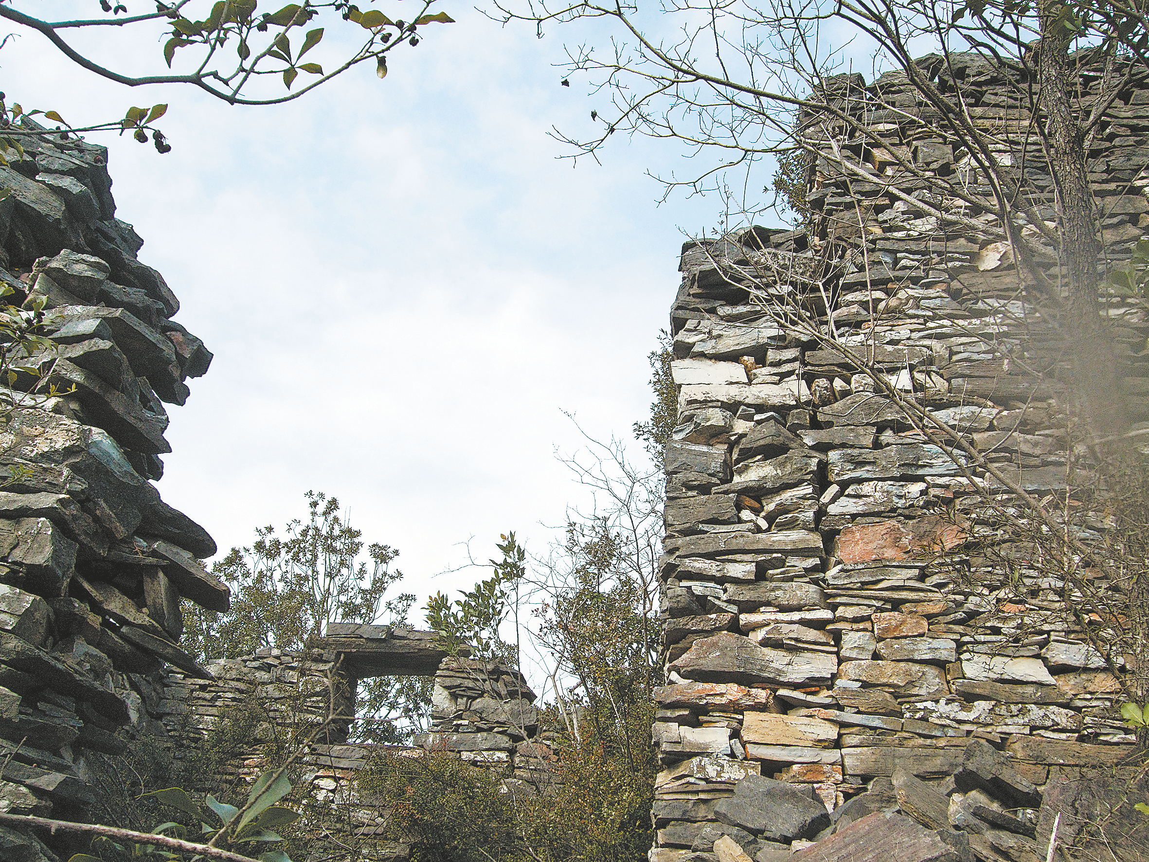 平臺(tái)后方的巖石上砌有高高的石墻,留有一門,進(jìn)入其中,像走進(jìn)石頭庭院里,沿中間通道到最高處,兩邊分布著錯(cuò)落有致的石頭房子,沒有屋頂,只有墻壁。石墻高約3米,厚約三四十公分,用的是青色薄石片,看似瓦片墻,墻面平整。石墻挺立巖石之上,歷經(jīng)數(shù)百年風(fēng)雨依然堅(jiān)固如初。