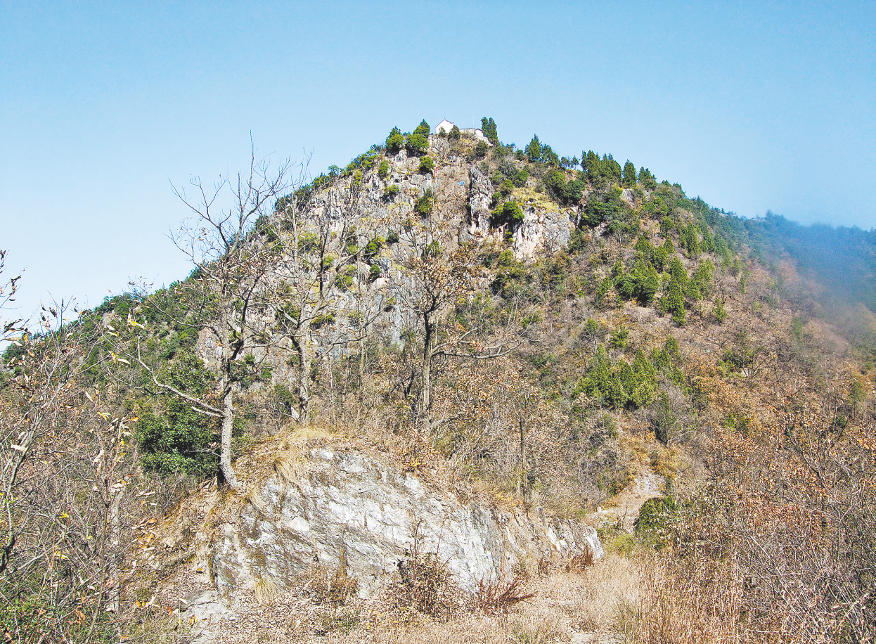 到了廟前,卻是另一番景象,廟的地基建在巖石上,白石為基,青磚砌墻,表面涂以白灰。墻外聳立著一塊塊半人高的巖石,如柱,如筍,如鼓,如鐘,扎根在巖石里,散開在山坡上,像是參加一場聚會。在這些凸出的巖石間,長著幾棵碗口粗形態(tài)怪異的冬青樹,每棵三五根樹干,白樹皮,綠樹冠。其余的多為鐵匠木,再往前便是斷崖。