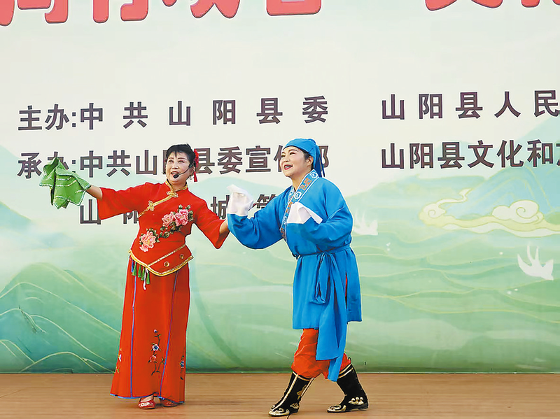 藝術(shù)團成員在山陽縣委舉辦的文化活動中表演《夫妻觀燈》。
