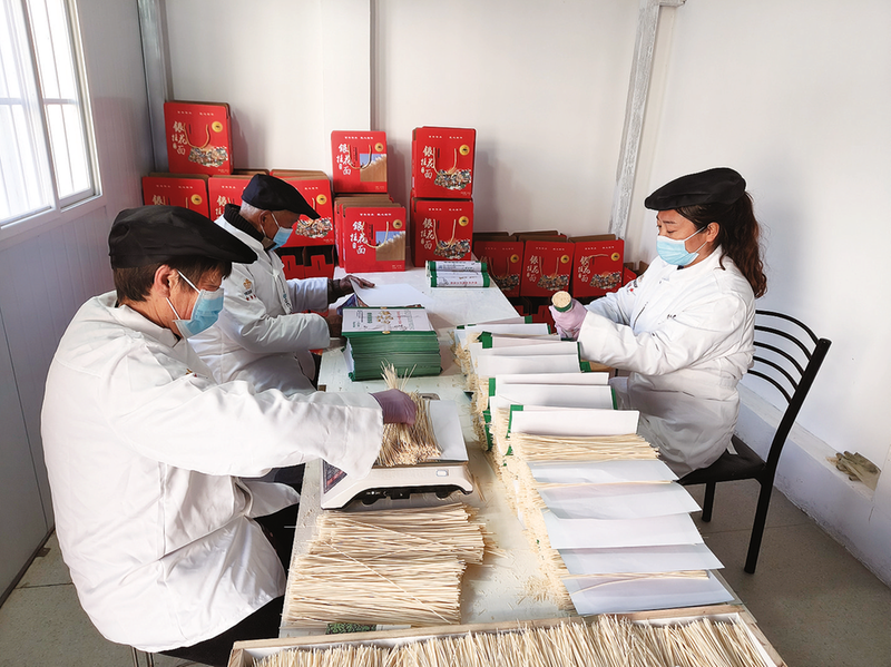 在絲絲情手工掛面專業(yè)合作社,務(wù)工人員正在包裝掛面。