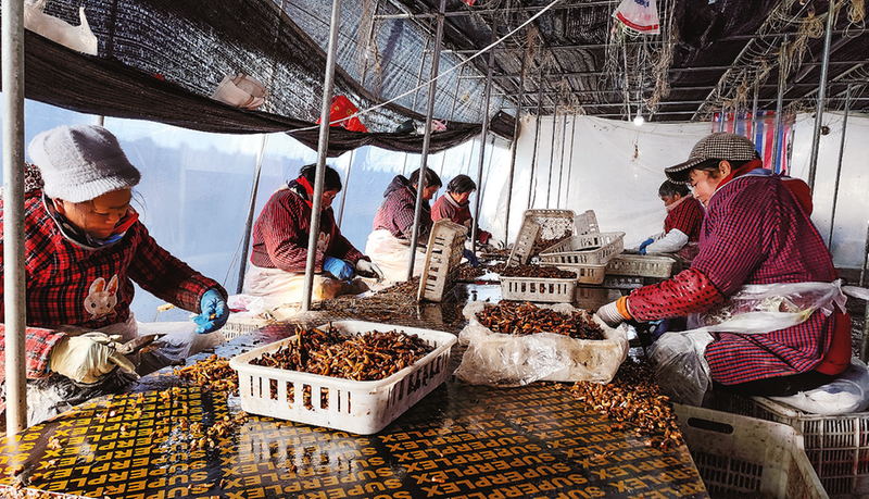 1月9日,康樂村滑子菇種植基地里,務工群眾對新采摘的滑子菇進行剪根作業(yè)。