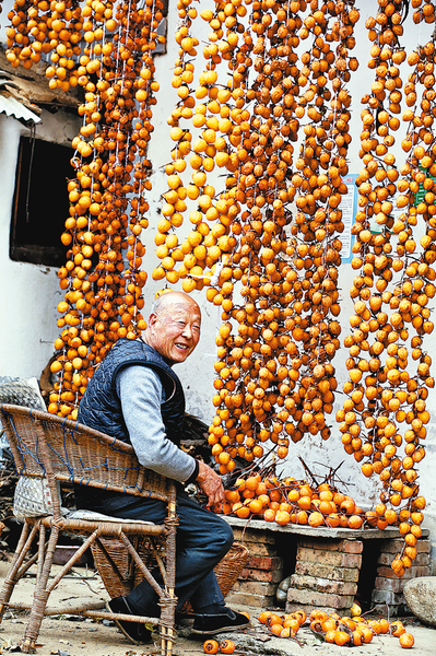 村民把去皮的柿子綁成串晾曬