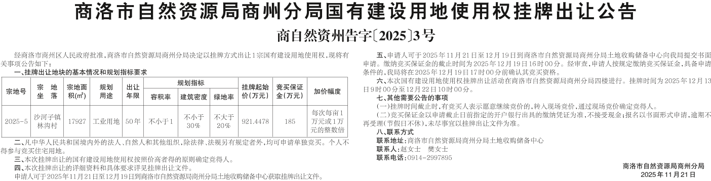 商洛市自然資源局商州分局國有建設(shè)用地使用權(quán)掛牌出讓公告