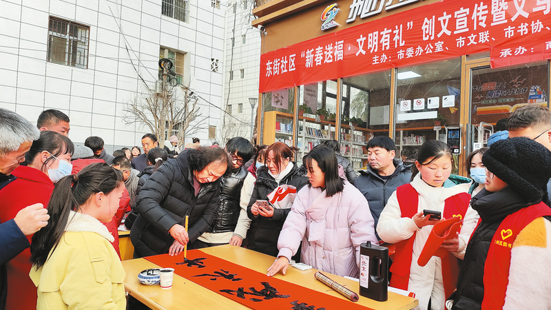 1月31日,商州區(qū)城關(guān)街道東街社區(qū)“新春送福,文明有禮”創(chuàng)文宣傳暨義寫春聯(lián)活動在區(qū)圖書館舉行,市區(qū)十幾名書法家現(xiàn)場揮毫潑墨,為群眾義務(wù)書寫春聯(lián)460多副,為馬年春節(jié)營造濃濃的新春文化氛圍。 (本報記者 賈書章 攝)