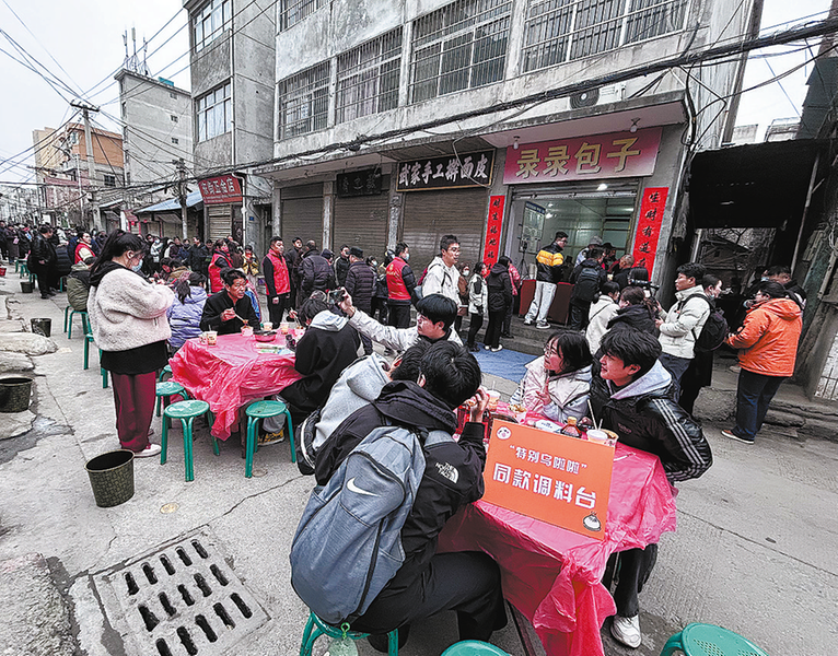 店外路邊整齊擺放著一排餐桌,十張桌子鋪上喜慶的紅色一次性桌布,每桌配八張凳子,一派熱情待客、如同吃席般熱鬧的場面。慕名而來的游客自東向西有序排起長隊,耐心等候品嘗這份熱氣騰騰的商州味道。