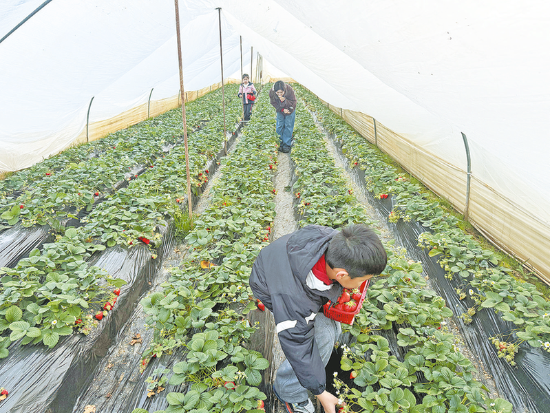 市民正在體驗(yàn)采摘草莓的樂趣。