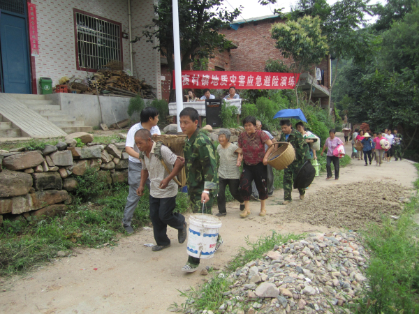 此次演練,以李河灘村一組一個崩塌隱患點因連續(xù)降雨誘發(fā)導(dǎo)致山體滑坡險情,13戶50人的生命財產(chǎn)安全受到威脅為背景。演練共分為“險情報告”、“搶險經(jīng)過”、“險情解除”三個過程?,F(xiàn)場成立臨時指揮部,指揮部下設(shè)有綜合協(xié)調(diào)組、應(yīng)急搶險組、轉(zhuǎn)移安置組、后勤保障組、監(jiān)測調(diào)查組、醫(yī)療救助組、治安保衛(wèi)組六個小組,共計40余人參加演練。演練中,職能工作小組各司其職,有的挨家挨戶組織群眾迅速撤離至臨時避災(zāi)點,有的入戶清場,有的對傷員進(jìn)行應(yīng)急救治,在應(yīng)急避險演練指揮部的指揮下下,有攙老抱幼的,有攜帶物品的,按照事先指定的撤離路線所有群眾全部撤離到安全地點,整個應(yīng)急演練既有分工又有協(xié)作,演練過程有序開展。