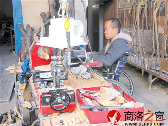 賈滿濤打算開啟第二次人生。他首先制作了一個康復(fù)站立架,改裝了一個電動輪椅,并請來朋友根據(jù)自己的設(shè)計在院里做了一個簡易升降器,因為房屋地基較高,想要出門還要下幾級臺階,有了這個升降器,就可以坐在輪椅里自由出行了。出行問題解決了,賈滿濤又想利用自己的一技之長,將村里的殘疾人召集起來,開個加工廠。想法雖好,但實踐起來卻有很多困難,一是工人都是殘疾人,很多工作都無法開展;二是資金困難,賈滿濤的第一個想法就此夭折了。此后,他還加工過殘疾人蹲便器、電動輪椅等,均因各種原因未能做長久。“我一直在努力的嘗試,告訴自己只要努力就會有希望。”賈滿濤說,他一直在關(guān)注鎮(zhèn)安殘疾青年馬華的微博動態(tài),“我和馬華在西安打工時就認(rèn)識,那時,我們都還是健壯的年輕小伙,不料幾年間,我們就相繼遭遇了意外。”執(zhí)著于公益事業(yè)的馬華在微博里經(jīng)常發(fā)一些各地殘疾人自立自強(qiáng)的貼子,看到雙腿高位截癱的婦女帶著笑容在田里耕地,無法行走的小伙依然學(xué)會了開車的故事,賈滿濤的信心更強(qiáng)更足了。有一次,他在看電視時無意中發(fā)現(xiàn)了獎杯上的刻字,就想“自己能不能也在玻璃、木頭上刻字呢?”賈滿濤上學(xué)時就愛好書法、繪畫,這么多年,也是一有時間就抽空練習(xí),有了想法他就嘗試用刀子在玻璃上或木頭上刻上字或小動物,感覺還不錯。他又自己改裝了幾臺機(jī)器,加工起串珠、手杖等木質(zhì)工藝品。然后開著電動輪椅拿著他的手工藝品去棣花景區(qū)賣,效益還不錯。“好的時候,一天賣個百十塊錢,能給娃娃買個紙、筆啥的。”殘疾的自己也可以掙錢了,賈滿濤很是欣慰。