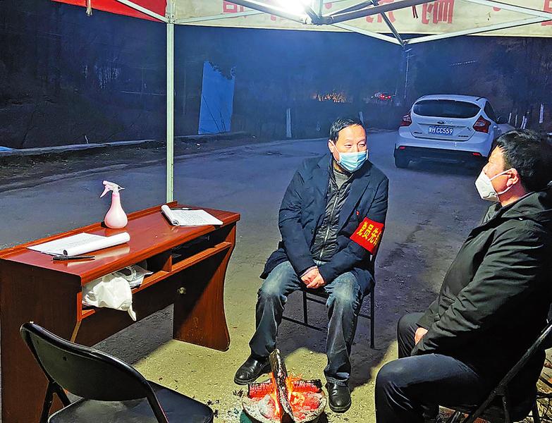 王衛(wèi)東(左)和村干部深夜在疫情防控檢測點值守