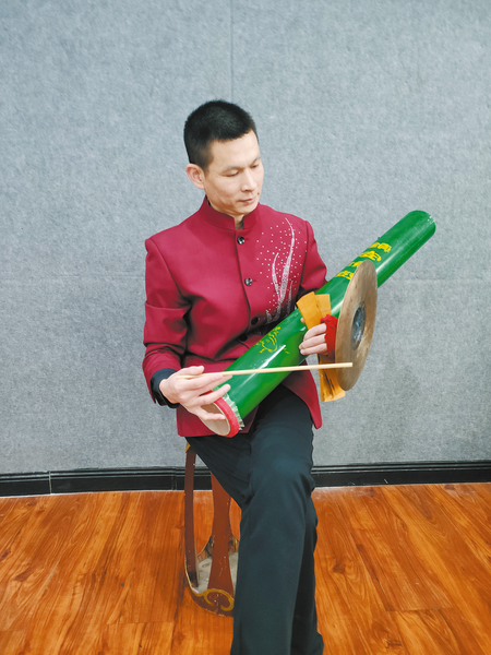 陳佩正在演奏鎮(zhèn)安漁鼓,鼓點(diǎn)鏗鏘,韻味悠長(zhǎng)。