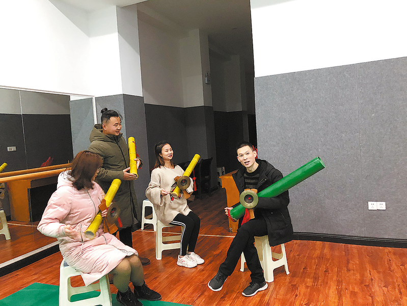 △1月6日,陳佩(右一)在鎮(zhèn)安縣劇團(tuán)排練廳里手把手指導(dǎo)青年學(xué)員。
