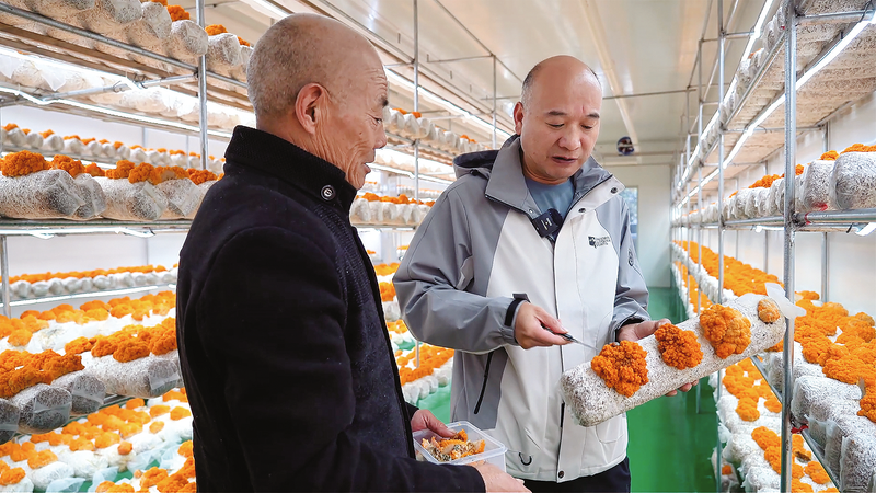 1月15日,在柞水縣山城美農(nóng)生態(tài)農(nóng)業(yè)科技有限公司的金耳種植區(qū)里,企業(yè)負(fù)責(zé)人陳盛林(右)檢查金耳生長情況。 (本報(bào)通訊員 李沁杰 攝)